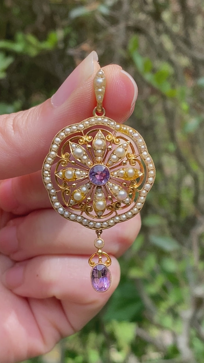 Edwardian Amethyst and Pearl 15K Gold Lavalier Pendant