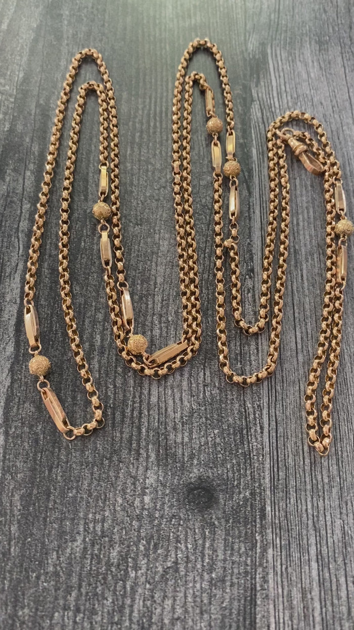 Antique English 9K Gold Belcher Trombone Link 61” Longuard Chain