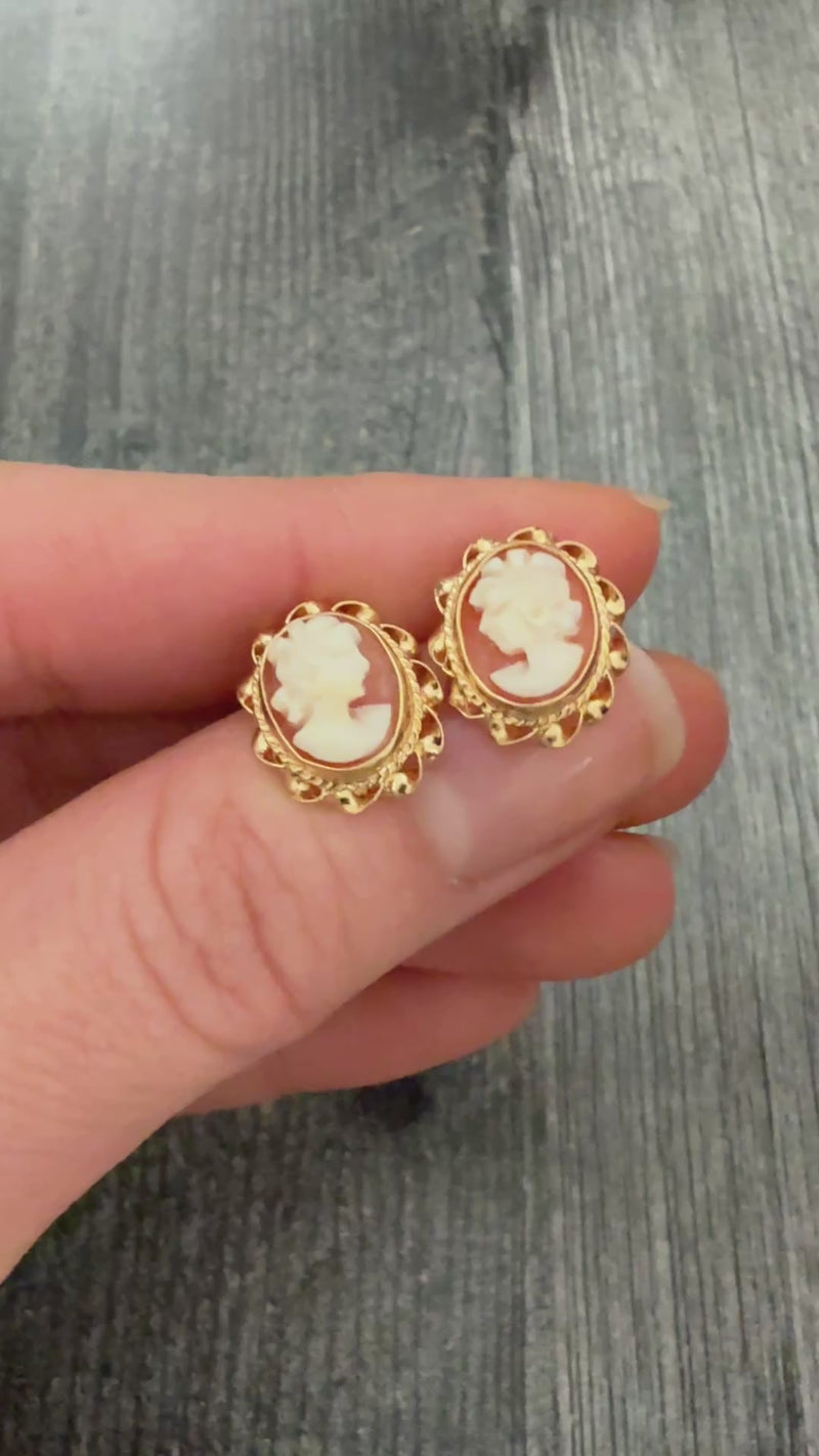 Vintage Carved Shell Cameo and 14K Gold Stud Earrings