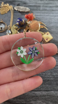 A pretty art glass pendant set within a 9K gold frame. The glass was designed with two blue and white flowers in the center. Very delicately done with lovely lines and colors. The bail of the gold frame is stamped with English assay marks and for 9K gold purity.