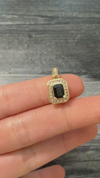 An inky blue emerald cut sapphire is set within a channel set diamond halo pendant. Modeled in 14K gold and stamped "14K" for gold purity.
