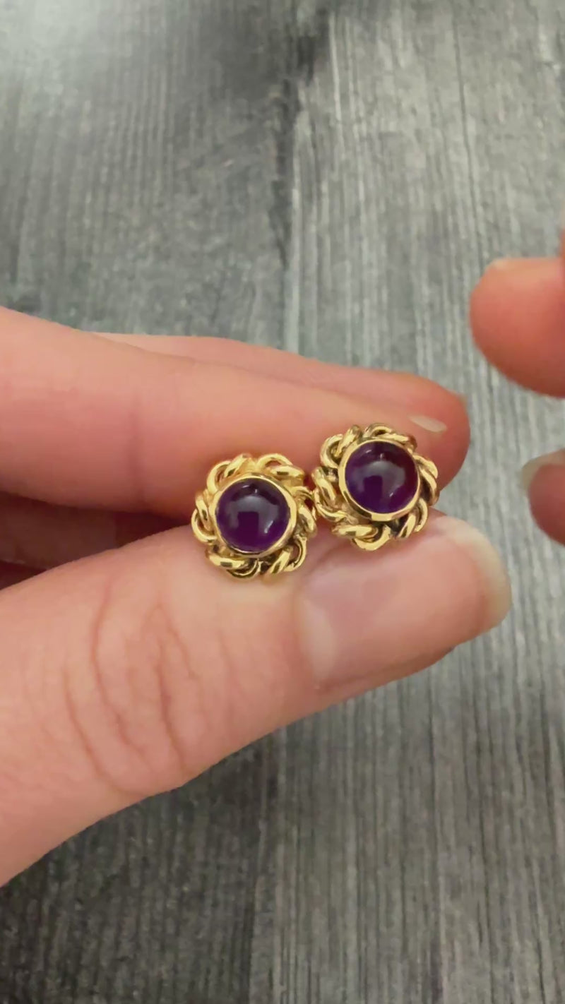 Cabochon Amethyst and Swirled Border Stud Earrings In 14K Gold