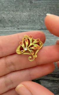 Art Nouveau Diamond and 10K Gold Enamel Foliate Pin
