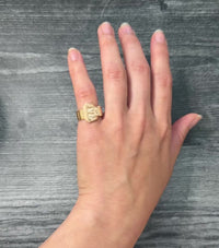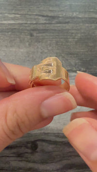 A retro era 14K rosy gold wide buckle band. The inside of the ring is stamped "14K" and inscribed "W.S. to L.S. 1944."