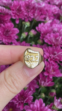 A rare Art Deco era date ring with the year “1922” on the front designed in the shape of a shield. The inside of the ring is stamped “14K” for gold purity marks.