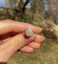 Art Deco Platinum and 14K Gold Pearl and Diamond Halo Ring