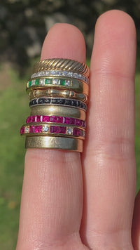 An Art Deco era platinum eternity band set with French cut onyx with beautifully engraved details. The band is a size 5 and measures 2.6 mm wide. Perfect as a wedding band, stacking ring, or worn solo!