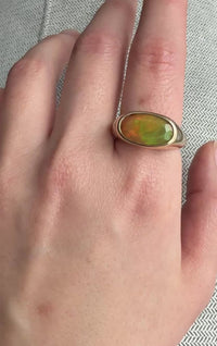 A natural faceted opal ring set east to west in a signet design! The central opal flashes with the bright hues of a chameleon - vibrant greens with fiery orange and yellow. Trillion cut diamonds are set along the shoulders for a bit of sparkle. The interior of the shank is stamped “14K” and “B-Kho” for gold purity and the maker’s mark.