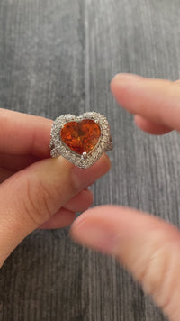 An absolutely stunning cocktail ring showcasing a bright, juicy heart shaped mandarin garnet surrounded by brilliant cut diamonds. The glowing center stone is also known as a spessartine garnet. It’s quite rare to find a large-scale garnet this eye clean, with such a vibrant color. Set within a 14K white gold setting surrounded by approximately 1 carat in diamonds, mostly H/I in color and I1/I2 in clarity. The inside of the ring is stamped “14K” for gold purity.