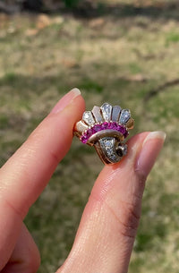 Retro 14K Gold, Diamond and Ruby Cornucopia, Fan Ring