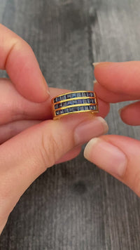 Three rows of velvety, deep blue sapphires are channel set in a rich 18K gold band! These calibrated stones weigh a total of approximately 2.43 carats. The interior of the band is stamped “750” for 18K gold purity.