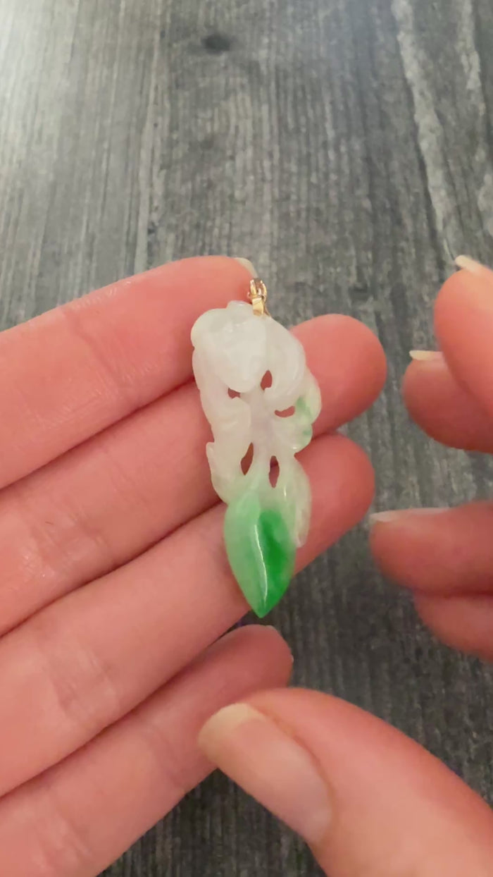 Carved Moss in Snow Jade Nine Tailed Fox and 14K Gold Pendant