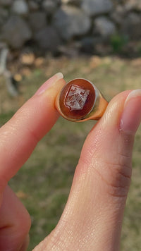 A charming 14K gold antique signet ring featuring a carved carnelian intaglio with what appears to be a crest with three ducks and three stars.  Ducks have long symbolized resourcefulness and finding them in a signet like this is so unusual.  The ring has a lovely age-old patina and feels so smooth to the touch.  The interior of the ring is stamped “14K” for gold purity.